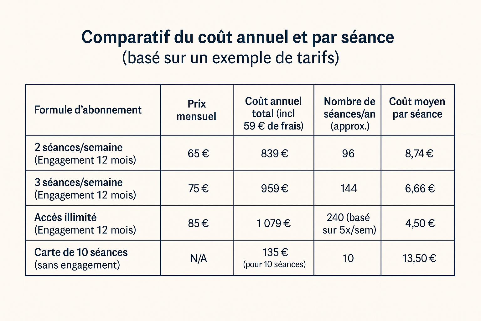 Le prix mensuel affiché ne raconte qu’une partie de l’histoire. Avec des frais d’inscription uniques (59 € en moyenne), le coût annuel total inclut ces frais fixes. Par exemple, un abonnement à 65 €/mois sur 12 mois coûte 839 €, soit 96 séances/an. Résultat : chaque séance vaut 8,74 €. Mais attention : plus vous enchaînez les séances, plus ce prix chute. Une formule illimitée à 85 €/mois (1 079 €/an) pour 240 séances réduit le coût à 4,50 € par session.